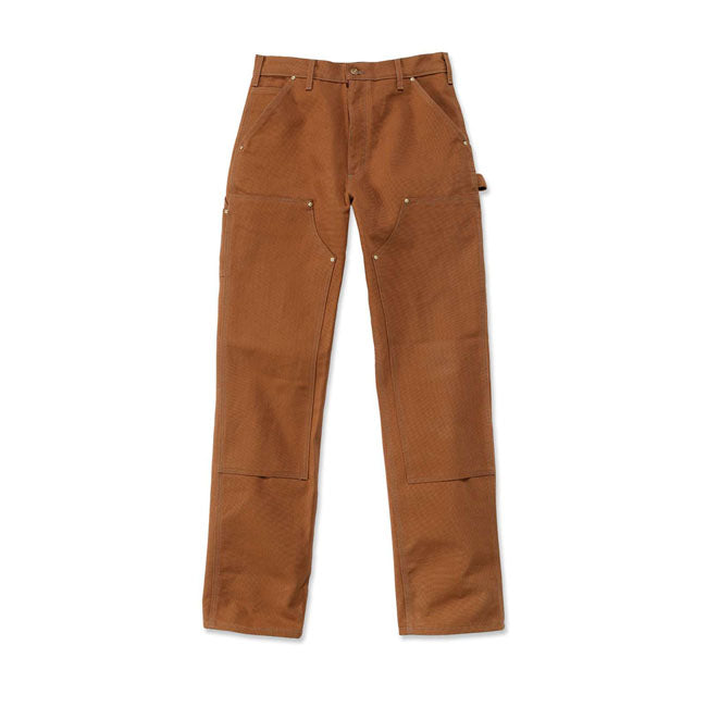LOOSE FIT; STRAIGHT LEG · 12 oz/yd² - 407 gsm · 100% Cotton · Firm duck · Sits at the waist · Long Trousers · Two front slant pockets with extra hidden coin pocket in right front · Left-leg hammer loop · Two fully lined back patch pockets · Double front panels for durability with bottom entry knee pad pockets · Right leg back utility pocket for easy storage of ruler or welding rods; left leg back tool pocket · Folded single stitched clean finished hem · Triple stitched main seams · Carhartt label sewn on pocket