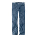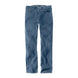 STRAIGHT FIT; TAPERED LEG · 11.25 oz/yd² - 381 gsm · 85% Cotton/14% Polyester/1% Elastane · Rugged Flex™ Denim · Rugged Flex™ - Eases movement · Sits slightly below the waist · Long Trousers · Two front pockets · Coin pocket in right front pocket · Two reinforced back pockets · Triple stitched main seams · Stronger sewn-on-seam belt loops · Carhartt label sewn on pocket